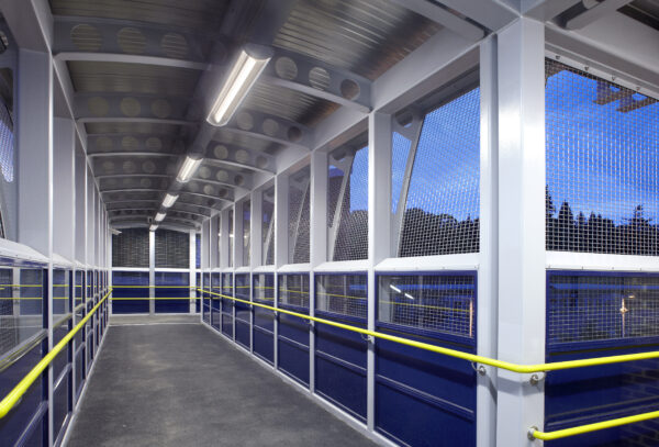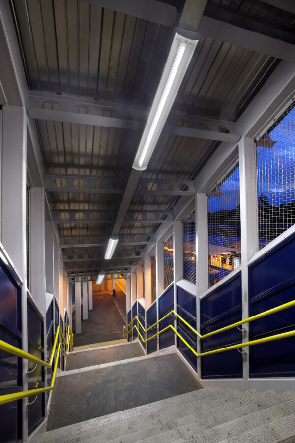 Stairs and footbridges vary in openness and construction. Effective lighting enhances safety and capacity by illuminating walking surfaces, treads, and risers. Additionally, it creates contrast between adjacent surfaces, ensuring visibility even when spaces are sparsely or fully occupied.